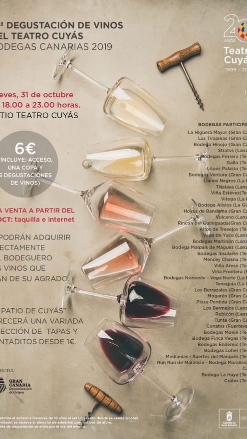Ya saben, si este jueves 31 de octubre quieren huir de ese Halloween que nos atomiza desde los países anglosajones, el teatro Cuyás los acogerá en su patio a un precio único de 6 euros la entrada, con 5 copas de vino incluidas, a partir de ahí, será usted el que viaje hasta donde quiera. La experiencia nos hace recordarles que esta es una noche en la que el transporte público se hace imprescindible para poder disfrutar con responsabilidad. Allí estaremos para vivirlo y contarlo en Por Fogones, de Canarias Ahora, todo lo que dé de sí una noche que, si el tiempo sigue acompañando, invitará a brindar por los especiales vinos que tenemos en las Islas Canarias.