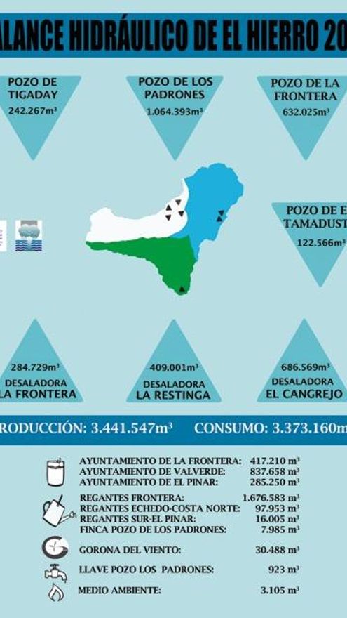 El Cabildo de El Hierro y el Consejo Insular de Aguas presentan una gráfica en la que se resume el Balance Hidráulico de El Hierro en 2017, en el que se aprecia que el Pozo de Los Padrones es el principal proveedor de agua en la Isla.