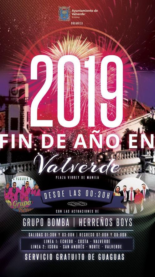 El Ayuntamiento de Valverde ha organizado una fiesta de Fin de Año en la plaza Virrey de Manila, a partir de las 00:30 horas del 1 de enero, con las actuaciones del Grupo Bomba y Herreños Boys.