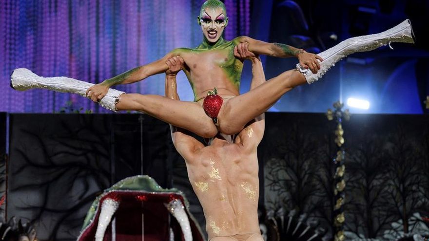 Con poca ropa, las acrobacias se impusieron en su espectáculo, de la mano del finalista de Got Talent, Levy, pareja artística en su dúo Levy y Estrella, y que alzó aún más alto al desde hoy y por segunda vez Drag Queen de la capital grancanaria.