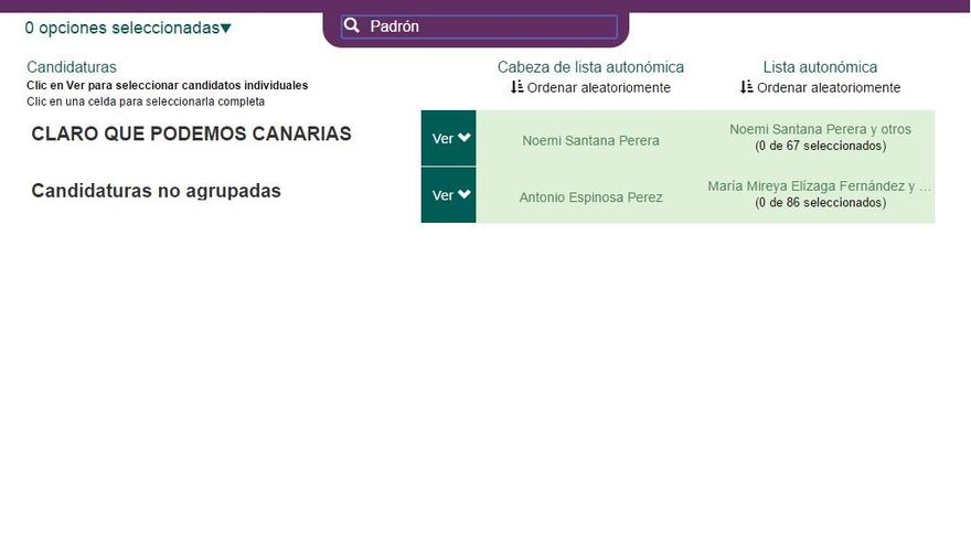 Al Gobierno de Canarias concurrirán dos listas, Claro que Podemos y Contigo Podemos, aunque esta última no aparece en el sistema informático de las elecciones, como refleja la imagen que se adjunta en este texto. La primera está liderada por Noemí Santana, licenciada en Administración y Dirección de Empresas y la única canaria en el Consejo Estatal del partido. La candidata destaca que su equipo está formado por una “mayoría de ciudadanos y no por una mayoría de poderosos”. Por ello señala que todos los colectivos de la sociedad estarán representados si votan su proyecto. Economistas, estudiantes, desempleados, maestros... son algunos perfiles que componen esta plancha, a quienes les une “las ganas de cambiar esta tierra”.