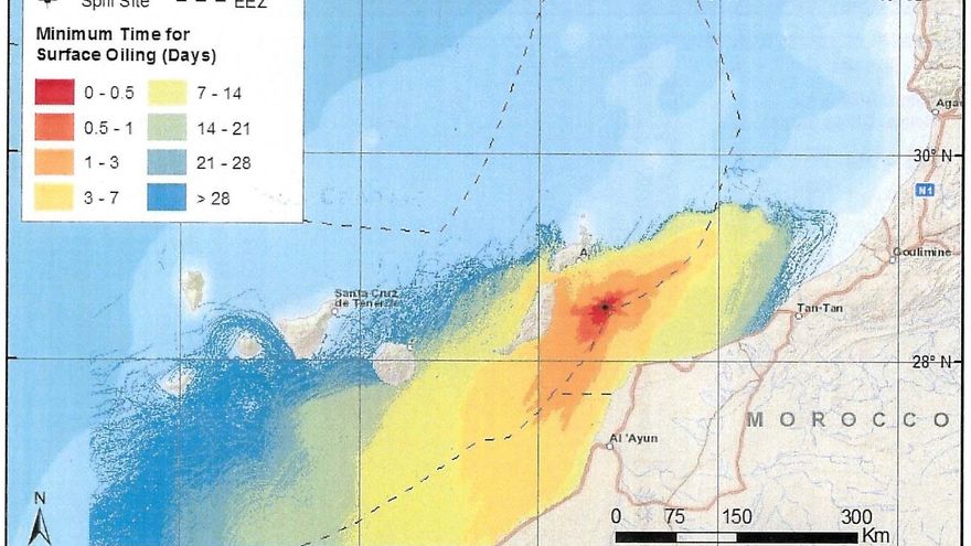 Las simulaciones de un posible derrame de petróleo encargadas por Repsol a un laboratorio han dado como resultado que, en caso de que se produjera un accidente durante el verano mientras se extraen unos 3.000 barriles de crudo al día, la marea negra llegaría en un 85% de los casos a Fuerteventura en un tiempo estimado inferior a las 48 horas. Una probabilidad que en invierno se sitúa en el 71% y en poco más de dos días.