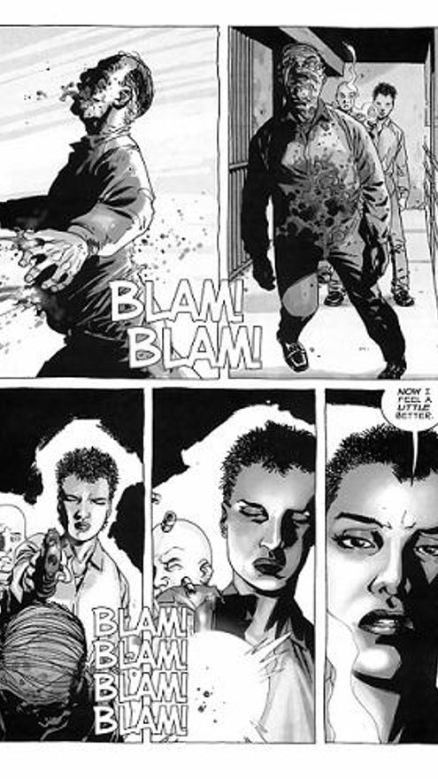 En cuanto al tema de dibujar un cómic en blanco y negro como The Walking Dead, soy perfectamente feliz con ello. Así es como me gusta ver mi trabajo, ya que en el pasado ha sido arruinado alguna que otra vez por los coloristas (risas). No me gusta ver color sobre mi trabajo… Lo que siempre he hecho, incluso cuando empezamos, es dibujar las páginas en términos de cómo me gustaría verlas impresas, sin color. Me gusta hacer que el trabajo de los coloristas resulte bastante difícil (risas). Así que Los Muertos Vivientes era un cómic perfecto del que encargarme, ya que incluso sin los tonos de gris, se vería realmente bien en blanco y negro. Dibujo de forma que me quede realmente satisfecho con el resultado, como si fuera un cómic en blanco y negro puro y duro.