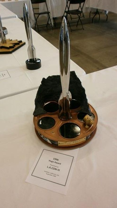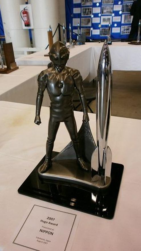 Solo quiero añadir que ejemplos tan sobresalientes como el Hugo entregado en 1996, en la L.A. Con III, celebrada en California, el cual reunía elementos tan icónicos como una bobina de cine, referencias al logotipo de la productora 20th Century Fox junto con el cohete por todos conocidos; o el Hugo entregado en la convención japonesa celebrada en el año 2007, Nippon, el cual reproduce, junto con el emblemático cohete, la no menos emblemática silueta de Ultraman -protagonista de la mítica serie de televisión de Eiji Tsuburaya- uno de los Hugo más espectaculares de las últimas décadas fueron ignorados por la gran mayoría de los asistentes.