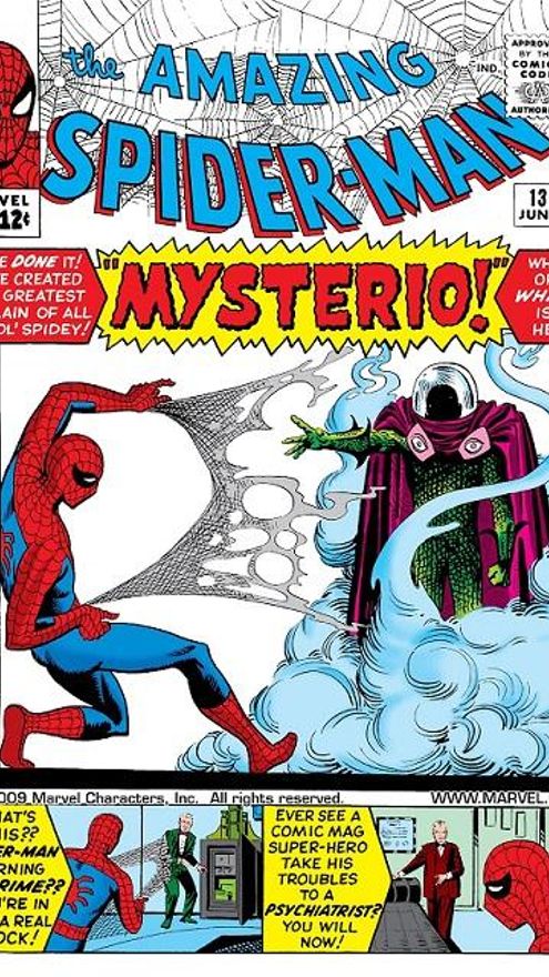 Es cierto que, en aquella primera ocasión, el rostro de Beck estaba oculto tras la grotesca máscara de uno de los falsos alienígenas que trabajaba para Phineas Mason “The Tinkerer” -conocido en nuestra geografía como “El chapucero”. Tras aquel discreto debut, debieron luego pasar once números hasta que, por fin, su alter ego maligno, Misterio, se diera a conocer. Esto ocurrió en una historia titulada “The Menace of... Mysterio!” que contó con una magnífica portada de presentación, dibujada para la ocasión por Steve Ditko, todo para el Amazing Spider-man# 13 (FP: junio 1964)