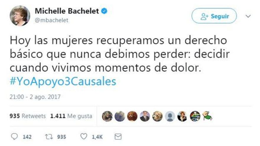 La presidenta de la nación, la socialista Michelle Bachelet, cumple así con uno de sus principales promesas electorales y devuelve al país al estadio legal anterior a 1989, cuando el gobierno de facto de Augusto Pinochet prohibía el aborto bajo cualquier circunstancia. “Hoy las mujeres recuperamos un derecho básico que nunca debimos perder: decidir cuándo vivimos momentos de dolor”, señalaba en twitter la máxima mandataria trasandina. Si el recurso que la derecha chilena ante el Tribunal Constitucional no prospera, Chile dejará de ser uno de los seis países del mundo que prohíbe el aborto en cualquier circunstancia.