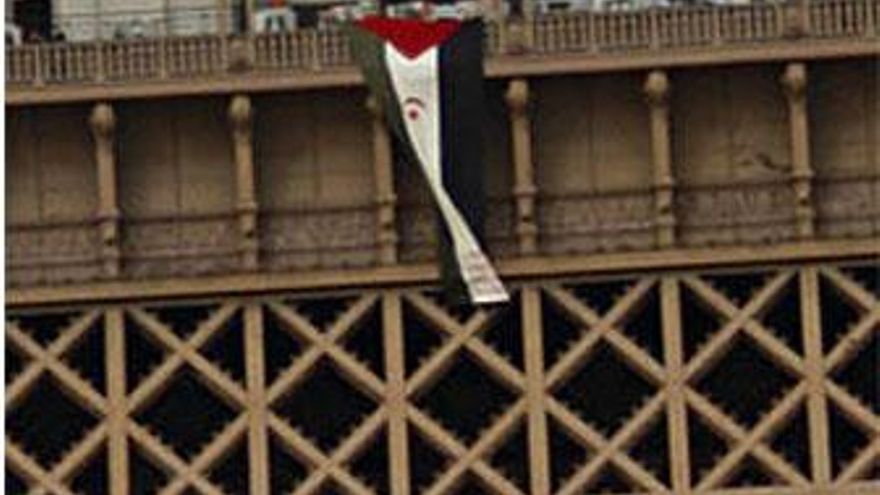 Una bandera saharaui ondeó este viernes durante 15 minutos desde el segundo piso de la Torre Eiffel, en París. Fue a las 11.00 (hora local) cuando seis activistas españoles por los derechos humanos para el Sáhara Occidental, pertenecientes a la Plataforma de Apoyo Político del Sahara, desplegaron la bandera, de diez metros de largo, con el objetivo de denunciar la detención por parte de la policía marroquí de siete defensores de Derechos Humanos saharauis. Este acto simbólico pretendía exigir la puesta en libertad inmediata. así como la de todos los presos políticos saharauis en las cárceles de Marruecos.