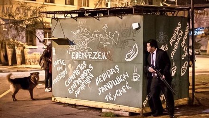 Un policía blande un arma de fuego durante los disturbios que se produjeron en Santiago de Chile tras la muerte de Rodrigo Melinao. Werken.cl