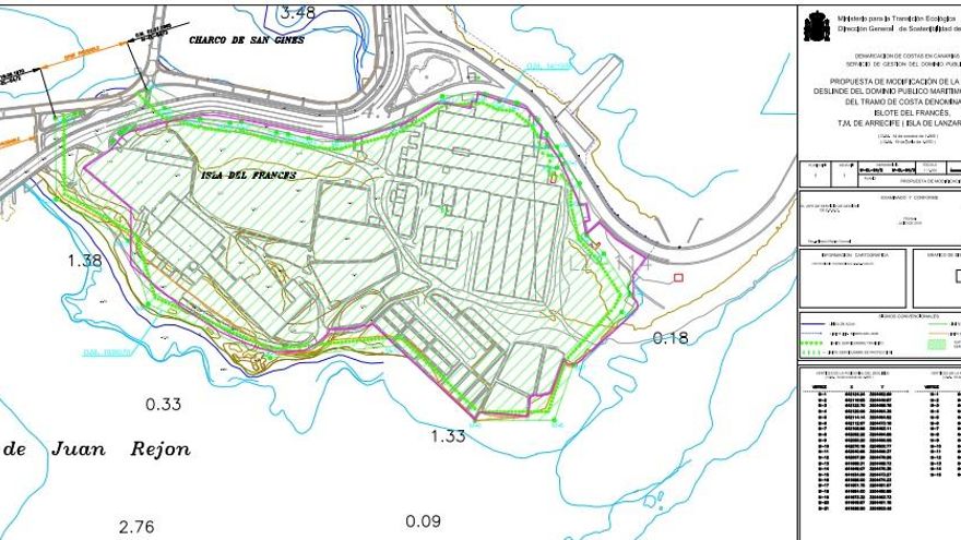 Ni edificios residenciales de siete plantas, ni grandes superficies comerciales. El último expediente de Costas tumba los planes de construcción que los propietarios del Islote del Francés, Lanzarote, tenían previstos para la joya urbanística más disputada y codiciada de Arrecife. El Ministerio para la Transición Ecológica publicó el pasado 3 de octubre un nuevo plano que extiende a la totalidad de la pieza de suelo la superficie afectada por la servidumbre de protección, de acuerdo con la Ley de Costas de 1988 que establece que dicha herramienta legal “imprescriptible” “recaerá sobre una zona de 100 metros medida tierra adentro desde el límite interior de la ribera del mar”, ampliando los 20 establecidos en el deslinde anterior.