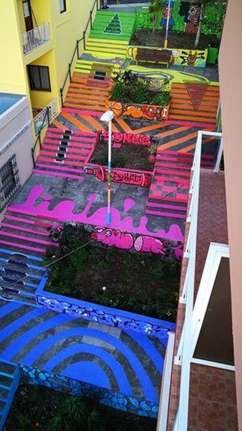 Uno de las últimas creaciones que ha realizado para una institución pública, en este caso el Ayuntamiento de Los Llanos de Aridane, ha sido una actuación en el barrio de La Montaña, en el marco del proyecto Efimeria. Okiman ha dado vida a las escaleras existentes cerca del Centro Cultural. “Mi estilo es muy alegre, con colores vivos y muchos contrastes; la gente se da cuenta de que se vive mejor con el color”, explica.