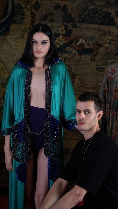 El nuevo kimono creado para la ocasión ha sido confeccionado de forma sostenible, reutilizando tejido (satén de seda en color verde esmeralda y violeta) y gran parte de los cristales y piedras semipreciosas (hematite y amatista) de colecciones anteriores. Desde que en el año 2018 Andrés Acosta colaboró por primera vez con EcoAge, todos sus pasos y la nueva dirección a la que se dirige su firma persigue mantenerse fiel a los principios de sostenibilidad y ecología de esta fundación. La muestra se compone de una selección de vestidos de noche pertenecientes a las colecciones La Divina Presencia y Metanoia de Andrés Acosta, realizados de forma artesanal e íntegramente en España en seda natural y bordados a mano en cristales, piedras semipreciosas y paillettes. La colección privada del hotel reúne desde kimonos japoneses realizados y bordados en seda e hilos de oro procedentes de los siglos XVIII y XIX que se completa con una chilaba dorada otomana del siglo XVIII, tapices de seda del siglo XVIII bordados en oro procedentes de China, y otras piezas decorativas como una arca de viaje y piezas de porcelana del siglo XVIII procedentes de China y Japón.