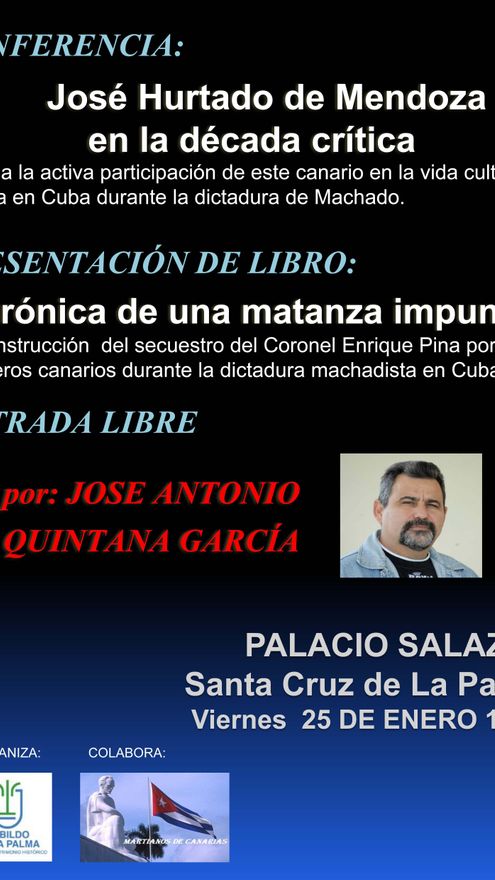 Este viernes 25 de enero, a las 19:00, en la Casa Salazar de Santa Cruz de La Palma, el historiador, periodista, investigador y editor cubano José Antonio Quintana García en su gira por Canarias impartirá la conferencia José Hurtado de Mendoza en la década crítica sobre este canario (sobrino de Benito Pérez Galdós) que se enfrentó a la dictadura machadista en Cuba, se informa en nota de prensa.