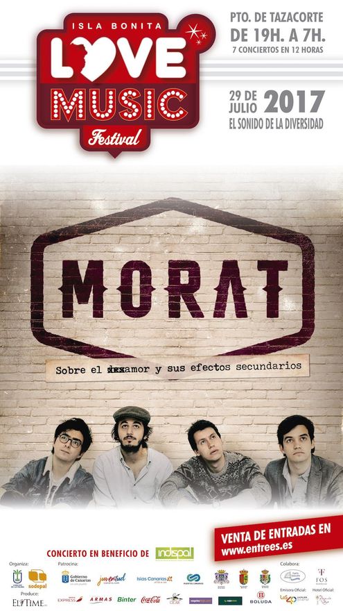 Su música hará vibrar a los jóvenes seguidores que ya son miles en La Palma y llegará a un gran público diverso que encontrará en sus canciones un sonido diferenciado que encaja perfectamente en el proyecto del Love Music Festival. No en vano, Morat, en su primer disco, ha conseguido el Cuádruple Disco de Platino por su éxito Cómo te atreves, cuyo videoclip atesora más de 50 millones de visionados, así como el Disco de Oro por Cuánto me duele, dos canciones extraídas de su álbum debut Sobre el amor y sus efectos secundarios. Han ganado el Premio a Artista Revelación del Año de Los40 Music Awards y han sido nominados al Premio Grammy Latino como artista revelación.