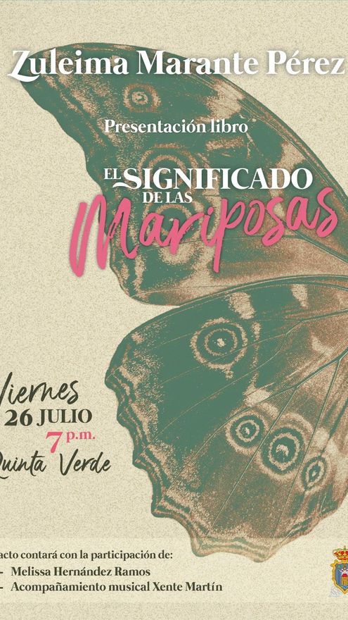La joven escritora palmera Zuleima Marante Pérez presenta el próximo 26 de julio su primer libro titulado El significado de las mariposas. El acto tendrá lugar, a las 19.00 horas, en la Quinta Verde de Santa Cruz de La Palma. La obra, escrita en verso libre y prosa poética, recoge una serie de relatos y pensamientos.