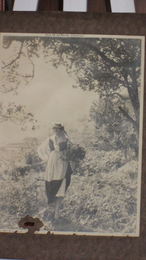 Aguado Jaubert recordó que la técnico María del Carmen Aguilar Janeiro es la responsable del Fondo Antiguo de La Cosmológica, y la encargada, por tanto, de inventariar y catalogar los documentos. En el texto que acompaña a la fotografía de 1927, en la que aparece un vestido corto, se explica que “las señoritas de la localidad de El Paso vistieron los trajes típicos de los pueblos de La Palma en la exposición de bordados a mano y tejidos de seda y otros organizada en el Teatro con ocasión de la visita del Excelentísimo Señor Ministro de Gracia y Justicia por el Alcalde Don Manuel F. Sosa Taño con la colaboración de Don Pedro Capote, Don Vicente Simón y Don Antonio Acosta”.
