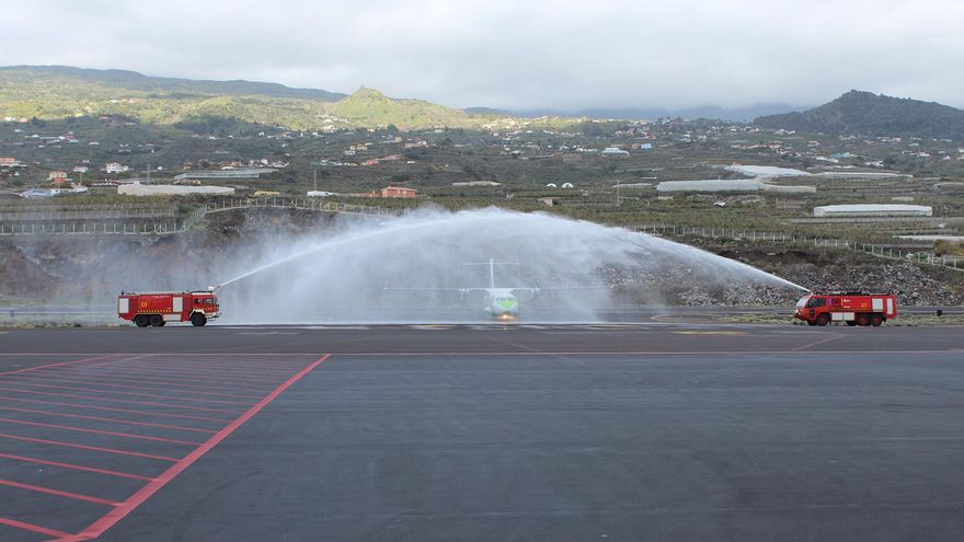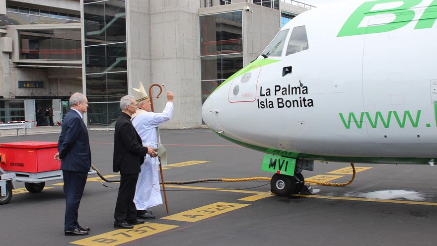 La aerolínea Binter bautizó este jueves un nuevo avión, modelo ATR 72-600, con el nombre de La Palma Isla Bonita para celebrar el compromiso que la compañía aérea canaria ha tenido con la conectividad y el desarrollo de la Isla desde hace casi tres décadas. El acto celebrado en el aeropuerto de Mazo estuvo presidido por el presidente de la compañía, Pedro Agustín del Castillo, y contó con la presencia del presidente del Cabildo de La Palma, Anselmo Pestana, además de los consejeros insulares de Promoción Económica y Empleo, Jordi Pérez Camacho, y de Turismo, Alicia Vanoostende, y del obispo de la Diócesis Nivariense, Bernardo Álvarez Afonso.