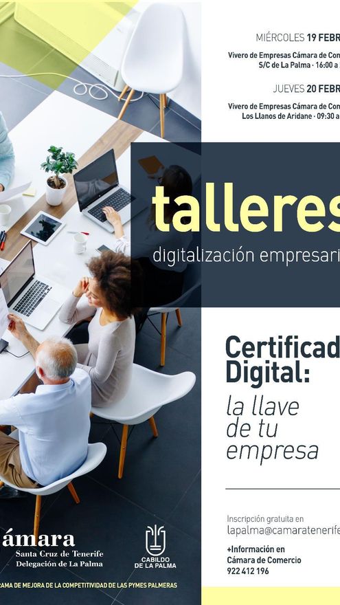 -Taller de Certificado digital: la llave de tu empresa: El desconocimiento de las oportunidades que ofrece el Certificado Digital como elemento de comunicación con la administración por parte del tejido empresarial hace de éste taller una formación necesaria para que el máximo número de empresas y autónomos no se queden desconectados y puedan acceder de forma segura, ágil y sin desplazamientos a una infinidad de trámites con los diferentes organismos públicos. Éste primer taller será impartido en los viveros de Empresas que la Cámara tiene en la isla, los días 19 de febrero de 16:00 a 20:00 horas para los asistentes a Santa Cruz de La Palma y 20 de febrero de 09:30 a 13:30 horas para los asistentes a Los Llanos de Aridane y así poder facilitar la conciliación de los turnos de trabajo de las empresas. Para participar, en cualquiera de los dos talleres programados los interesados deben contactar con la Delegación de la Cámara de Comercio en La Palma telefónicamente a través del 922 412 196 o registrándose en estos enlaces: Para Santa cruz de La Palma: https://www.camaratenerife.com/…/cursos-…/formacionmore/3116 Los Llanos de Aridane: https://www.camaratenerife.com/…/cursos-…/formacionmore/3117