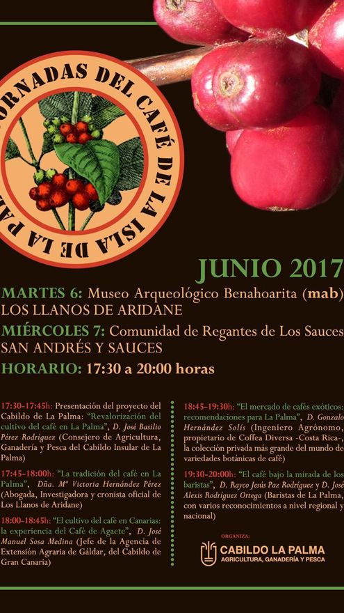 Los ponentes de las jornadas serán María Victoria Hernández Pérez, investigadora y cronista oficial de Los Llanos de Aridane; José Manuel Sosa Medina, jefe de la Agencia de Extensión Agraria de Gáldar y uno de los impulsores del Café de Agaete; Gonzalo Hernández Solís, ingeniero agrónomo de Costa Rica propietario de Coffea Diversa, la colección privada más grande del mundo de variedades de café; y Rayco Jesús Paz Rodríguez y José Alexis Rodríguez Ortega, baristas palmeros con varios premios regionales y nacionales.