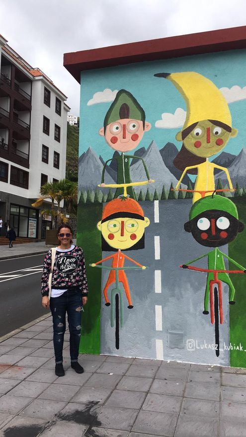 Deseo que me acompañen en este paseo por las nuevas manifestaciones artísticas de la isla. Próxima parada Santa Cruz de La Palma, concretamente en la Avenida de El Puente se titula Ciclistas saludables, ubicada exactamente frente al CEIP Gabriel Duque Acosta de la mano del artista polaco afincado en la Isla Lukasz Kubiak, este mural conlleva la difusión de hábitos saludables y los beneficios de la multiculturalidad (4). Ver más en artículo de este mismo medio lapalmaahora.com este mural está dentro del Proyecto Capital de Color iniciativa de la Concejalía de movimiento vecinal de Santa Cruz de La Palma, que con gran acierto apuesta por el embellecimiento de zonas urbanas de la mano de diferentes artistas y colectivos.