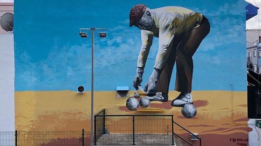 Seguimos por Breña Baja, que también hace una clara apuesta desde su Ayuntamiento por embellecer su municipio, el artista Erik Air, artista multidisciplinar y autodidacta, acaba de terminar otra de sus obras, siempre maravillosas, sigo a Erik y he visto algunos de sus trabajos tanto aquí como en San Cristóbal de La Laguna. En esta ocasión su trabajo está ubicado en Calle Gumersindo Galván de las Casas y se titula Señor jugando a la petanca.