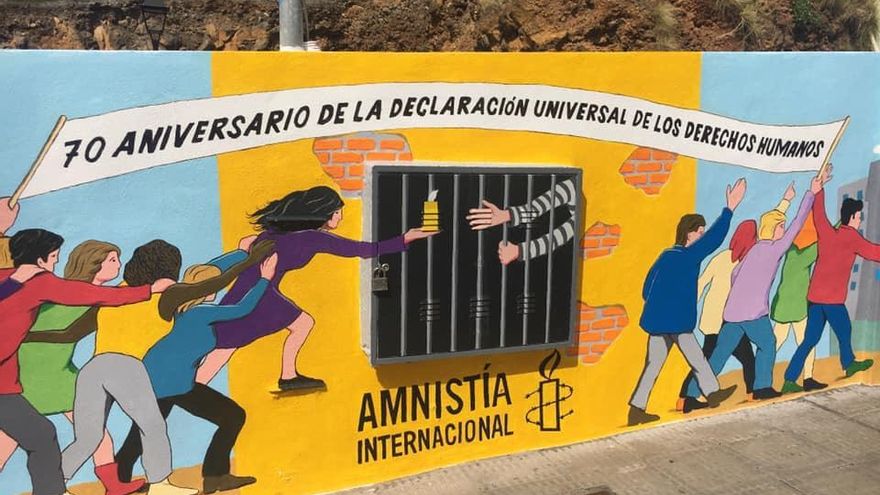 Finalizamos en Breña Alta. Su Ayuntamiento apoya también el Street Art, en esta ocasión de la mano de Manu Marzán (pintor e ilustrador) apoyado por varios colectivos y asociaciones. Todo un artista consolidado a modo de capitán, hacen unos murales con mensajes de Amnistía Internacional en la calle Blas Pérez González por su 70 aniversario, un mural de 32 metros de longitud, en el corazón de San Pedro.
