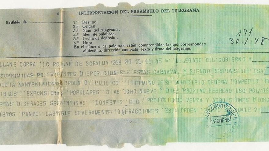 En 1948 el delegado del Gobierno en La Palma remitía un telegrama al alcalde de Los Llanos de Aridane, y supongo que en igual sentido al resto de las alcaldías de La Palma, dando instrucciones concretas de la prohibición tajante de los festejos y manifestaciones del Carnaval. El telegrama mencionado, con fecha 26 de enero de 1948, se custodia en el Archivo Municipal aridanense. El texto del telegrama, adaptado para una mejor comprensión de lectura, aunque ilustra este trabajo, es el siguiente: