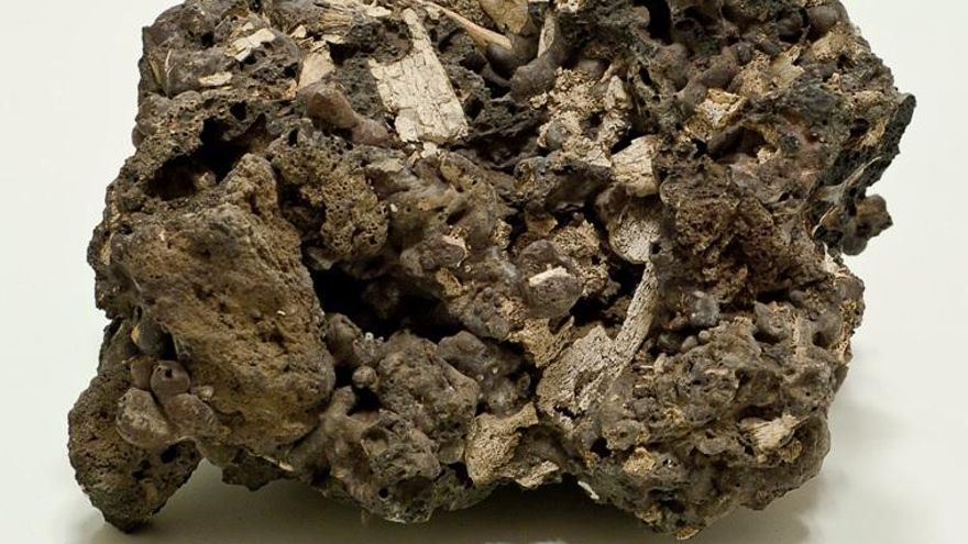 Posteriormente, el 12 de septiembre de 1997 acudimos a la Sala de Arqueología del ex-convento de San Francisco (Santa Cruz de La Palma) para inspeccionar el gran bloque de lava con abundantes incrustaciones de huesos humanos que se guardaba en la parte baja y cerrada de una de las vitrinas del museo. En esta ocasión fuimos acompañados por Juan Carlos Carracedo, Simon J. Day y Bruce Nelson (University de Whasington, Seattle, USA) quien, a través del estudio de los restos óseos, nos proporcionará información sobre la dieta alimenticia de estas gentes. Pueden imaginarse su sorpresa cuando vieron esta pieza arqueológica, puesto que en la necrópolis de La Cucaracha sólo tuvieron acceso a minúsculos fragmentos óseos recubiertos de lava.