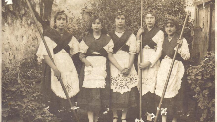 NOTA: La foto que ilustra este trabajo, evidentemente, no corresponde al tiempo que ocupa este trabajo. Debe ser de los años 20 en Aridane y curiosamente algunas de las mujeres que portan las preciosas lanzas son familia de Benigno por los Carballos y también por los Wangüemert.