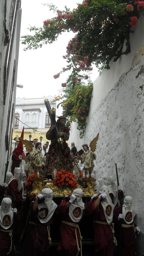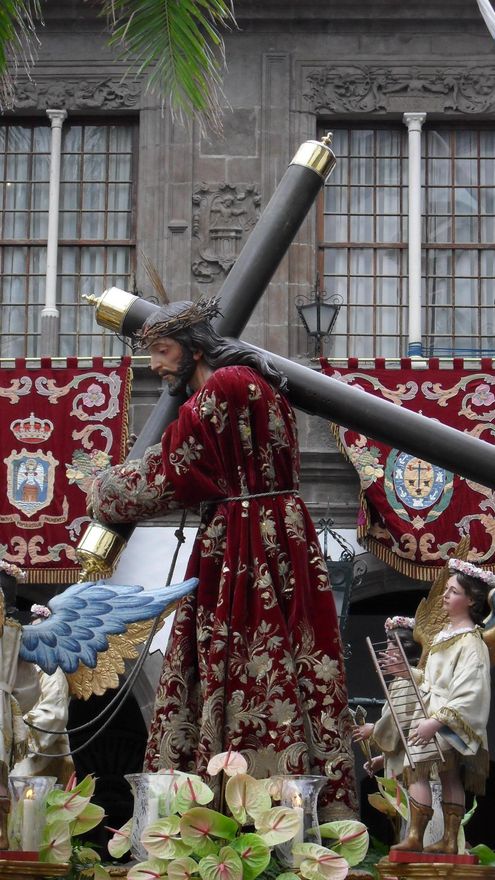 La imagen del Nazareno, escultura en madera policromada de 164 cm de altura, sale procesionalmente sobre una magnífica base o trono de estilo rococó, en madera sobredorada y calada con decoración de rocallas asimétricas, la mejor que se encuentra en la isla, rematando su conjunto cuatro preciosos ángeles, esculpidos por un esclavo negro cubano que, en la búsqueda de efectos realistas, les había colocado unos ojos de cristal. Se muestran vestidos “a la romana” y coronados por bellas guirnaldas de flores artificiales. “Como símbolos de los poderes que vencieron al demonio, estos espíritus celestiales llevan los instrumentos de la pasión de Cristo”, como los clavos, unas escaleras y una bien trenzada corona de espinas. También sujetan las cuerdas doradas que atan la imagen de Cristo subiendo al Calvario. Estas piezas fueron donación del rico comerciante palmero Cristóbal Pérez Volcán (1725-1790) y enviado desde La Habana. Son los llamados Ángeles de la Pasión, descritos por Pérez Moreras como “figuras afeminadas, efébicas y delicadas, que posan con gracia rococó. Su pequeño tamaño y las carnaciones brillantes les dan una apariencia de porcelana…” El mismo investigador palmero continúa informando de que “estas figuras angelicales, vestidas a lo romano, pusieron de moda en La Palma un tipo de ángel decimonónico y clasicista, de expresión candorosa y risueña y blancos hábitos inmaculados (el color predilecto del neoclasicismo)…” De esta manera, el máximo representante de este nuevo arte en la Isla, el escultor Aurelio Carmona (1826-1901), se inspiró en estas bellas piezas pasionarias para ejecutar los cuatro ángeles que custodian las veneradas imágenes de San Sebastián, en la ermita homónima de la ciudad, y en las del Gran Poder de Dios en el templo parroquial de la Villa de San Andrés (Fernández García).