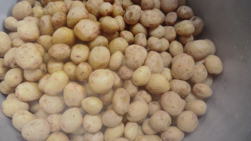 Para las papas arrugadas, con piel, hace falta lo que llamamos “dos aguas”. La primera las lavas y retira la tierra adherida y luego una segunda agua para guisarlas. Para ambos “pasos” se puede emplear agua salada, agua de nuestro océano Atlántico. Incluso parte de la última agua se puede conservar en el llamado “caldero de las papas”, tiznado y ahumado, en el que mantenían la sal (salmuela) para un nuevo guisado.