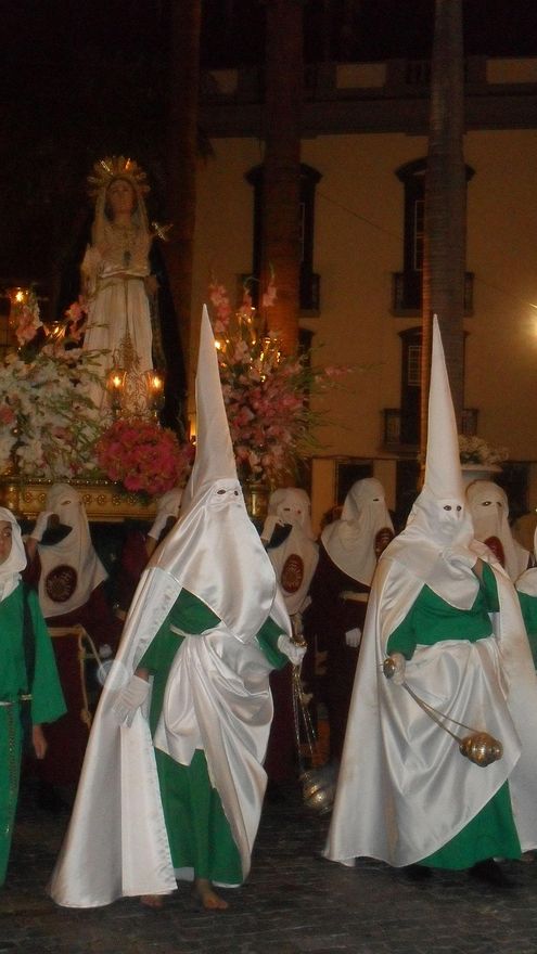 La puerta grande de la iglesia del antiguo cenobio de San Miguel de las Victorias —fundado en 1530 por el evangelizador del Nuevo Mundo, fray Domingo de Mendoza y convertido durante siglos en uno de los primeros conventos de Canarias— se abre en la noche del Martes Santo para permitir la salida de la sobrecogedora imagen del Cristo de la Columna. Comonos detallaba el desaparecido historiador palmero Fernández García, «la imagen del Divino Cautivo, en escorzo, aparece ligeramente forzada sobre la columna, destacándose en esta escultura el buen acabado de sus pies y sus manos». Su autor fue el discreto imaginero peninsular Andrés Falcón San José quien la esculpió a mediados del siglo XX.