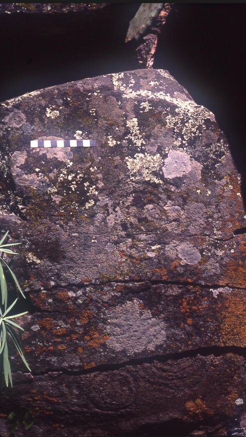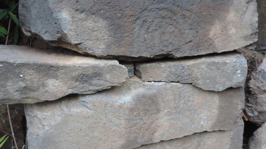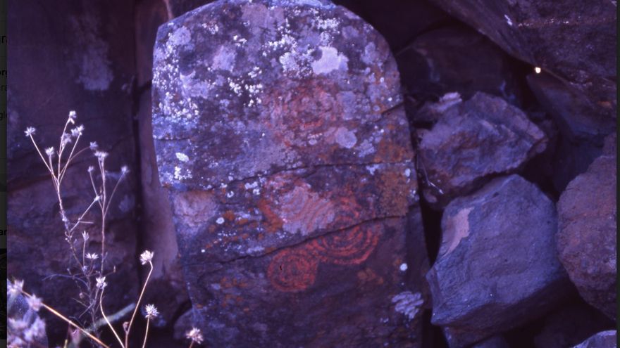Pero a nosotros solo nos interesa un panel que está situado junto al sendero que recorre todo el conjunto arqueológico-etnográfico. Tiene como soporte los paredones verticales de los riscos y está expuesto hacia el sur. Los motivos son espirales y círculos concéntricos. En 1988, aparte de estar completamente cubierto de líquenes, estaba en perfecto estado y los únicos desperfectos consistían en varias grietas naturales que atravesaban la anchura del panel.