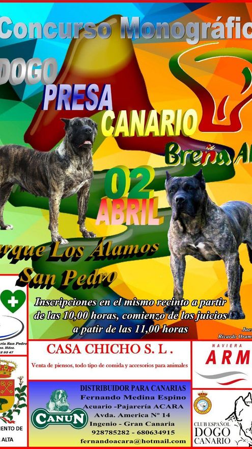 El Parque Los Álamos de San Pedro acogerá el próximo sábado, 2 de abril, el I Concurso de Dogo Presa Canario organizado por el Club Español de Dogo Canario con la colaboración del Ayuntamiento de Breña Alta. Las inscripciones para este campeonato canino, cuya asistencia es gratuita, podrán realizarse a partir de las 10:00 horas del día de la celebración. Los juicios, a cargo de Ricardo Oramas Miranda, comenzarán a las 11:00 horas.