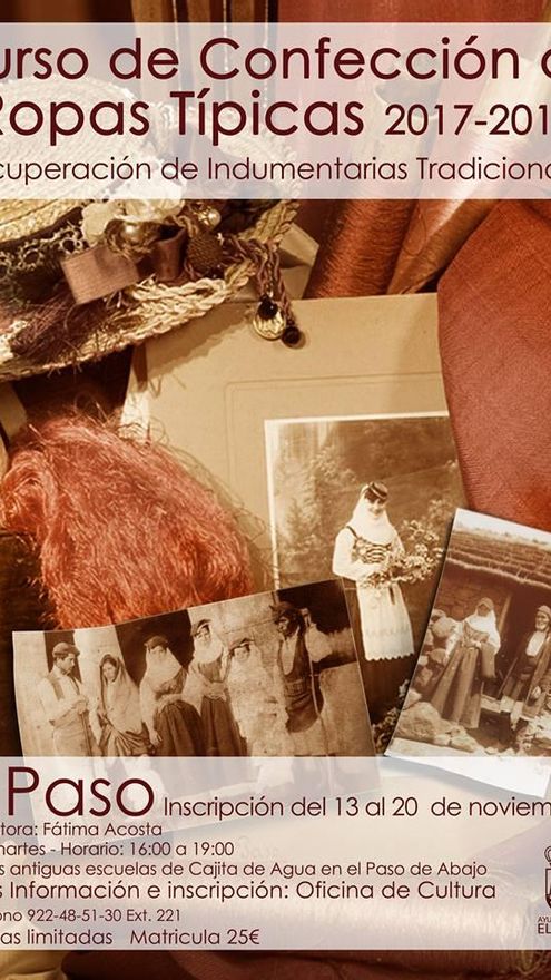 En el caso del curso de confección de trajes típicos, el plazo de inscripción será entre el 13 y el 20 de noviembre. El curso, impartido por Fátima Acosta, comenzará el día 21 del corriente en las antiguas escuelas de Cajita de Agua en el Paso de Abajo, los martes de 16:00 a 19:00 horas. Las plazas son limitadas y la inscripción y matricula costará 25 euros (Más información en la Oficina de Cultura del ayuntamiento de El Paso“.