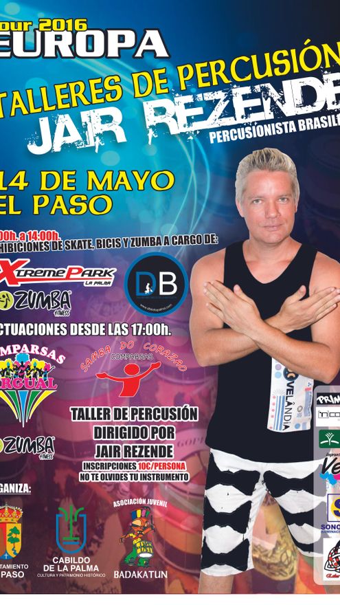 El próximo sábado, día 14 de mayo, desde las 11:00 horas el percusionista Jair Rezende dará clases magistrales en el parque infantil de El Paso dentro de la gira europea que está realizando este maestro de la percusión, conocido en el mundo por ser uno de los músicos de Carlinhos Brown, según se informa en nota de prensa.