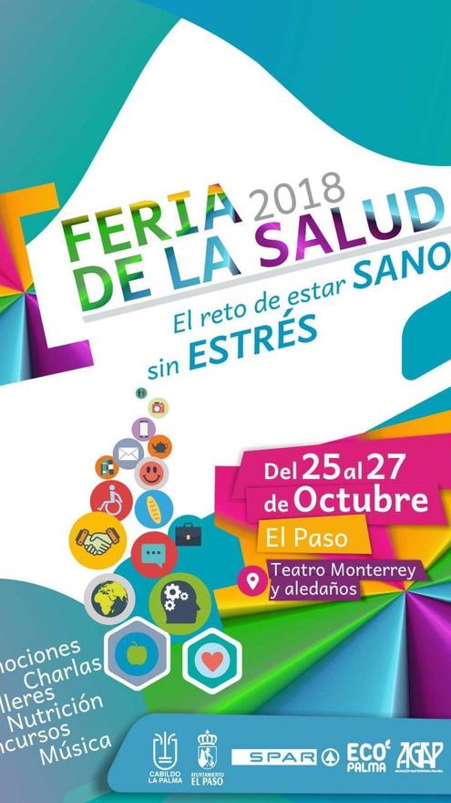 El municipio de El Paso celebra en el Teatro Monterrey y aledaños la I Feria de la Salud del 25 al 27 de octubre, bajo el lema El reto de estar sano sin estrés, informa el Ayuntamiento en una nota de prensa. Charlas, talleres, nutrición, concursos, emociones, y música, centrarán el amplio programa de actividades para toda la familia.