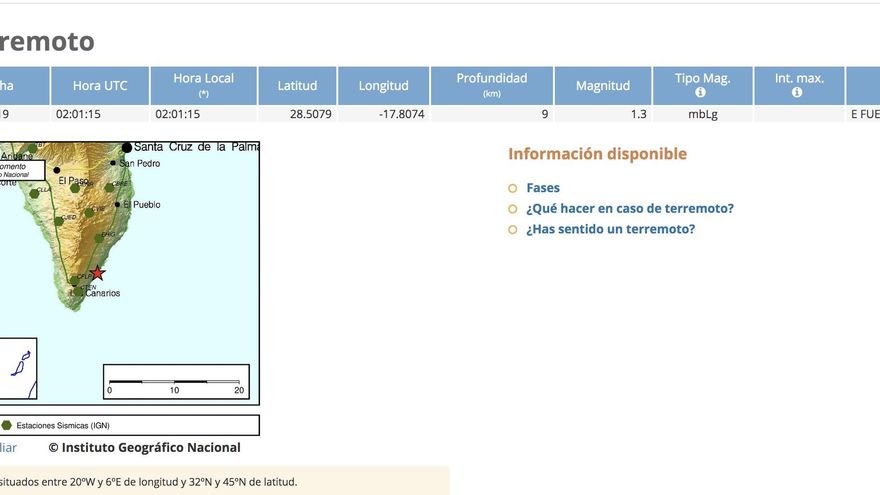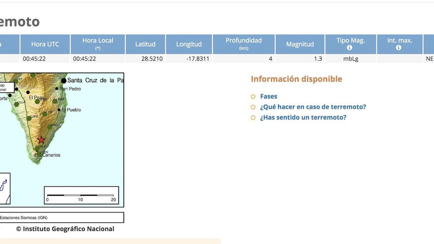 La red de vigilancia volcánica en La Palma del Instituto Geográfico Nacional (IGN) ha registrado este martes, 19 de noviembre, en el municipio de Fuencaliente dos movimientos sísmicos de magnitud de 1,3 en la escala de Richter.