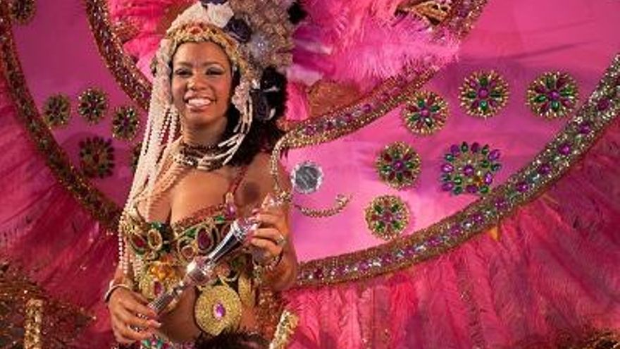 En la puesta en escena de su fantasía, de más de 3 metros de altura, Claudia desplegó su mejor sonrisa y derrochó grandes dosis de ritmo, alegría y colorido con un traje en el que predominaba el rosa y el dorado, e incluía grandes flores de pedrería, aves, muchas plumas y un exuberante arco a su espalda que manejó con destreza, bailando al más puro estilo carnavalero.