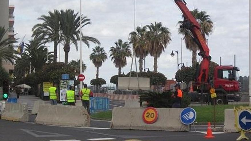 (En la imagen, tomada este lunes, operarios vallan la rotonda de Blas Pérez)