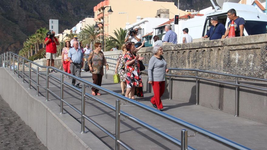 La playa de Santa Cruz de La Palma, por fin, ya se puede disfrutar. En la mañana de este jueves un grupo de bañistas ha inaugurado el espacio. La espera ha sido larga: las obras se iniciaron en octubre de 2011 y, tras un retraso de casi cuatro años, han concluido este mes de abril. El nuevo espacio de ocio de arena negra mide 550 metros de longitud. La ciudad recupera su contacto con el mar.