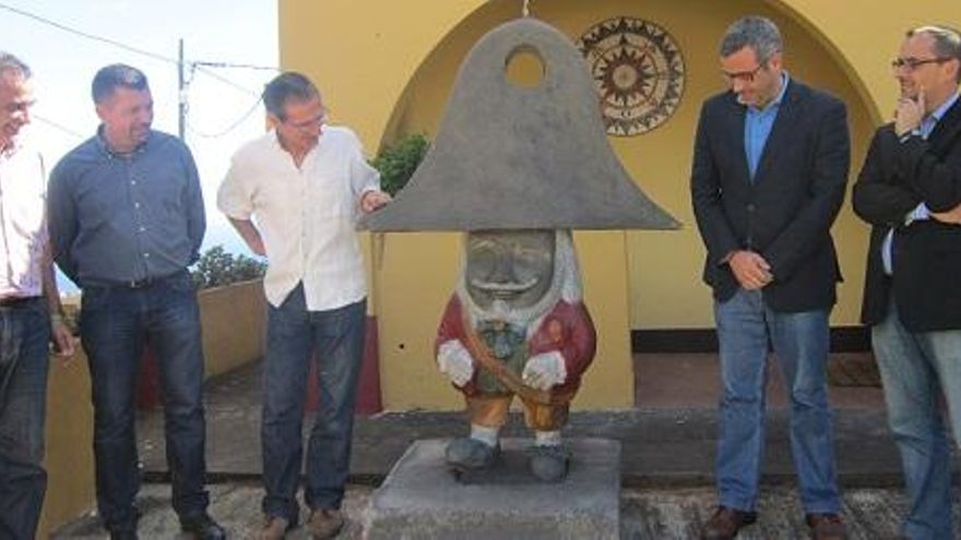 Ha sido denominado 'Con él nace la vida' porque será el primer elemento que se sumergirá en el parque submarino que se proyecta en el litoral de Santa Cruz de La Palma. El prototipo de la figura de los enanos que se hundirán en el lecho oceánico, cerca de la futura playa, ha sido presentado este jueves, en el taller Abora de Breña Alta, por el concejal de Urbanismo, Juan José Cabrera Guelmes, y por el autor de la pieza, el artista Miguel Marsán. “Para nosotros hoy es un día importante y también para el municipio de Santa Cruz de La Palma porque de forma fehaciente ya se ve el comienzo de un proyecto en el que se lleva varios años trabajando, un parque temático submarino”, señaló Cabrera Guelmes, quien estuvo acompañado en el acto por el alcalde, Sergio Matos, y varios concejales. “Estamos trabajando para que el municipio cuente con un atractivo especial, singular, y sobre todo diferenciador de cara al turismo que viene a La Palma”, insistió. Recordó que un equipo técnico especializado, integrado por Fernando Sanfiel, que ha coordinado los aspectos técnicos del enano, y el escultor Miguel Marsán, llevan casi un año perfilando el proyecto.