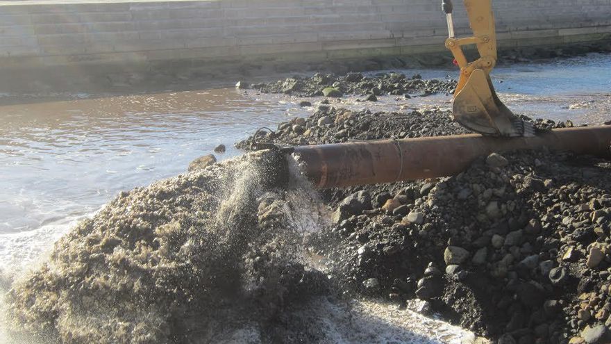 En la imagen, el espectacular chorro de arena y agua que bombea la playa la draga Volvox Atalanta. Foto: LUZ RODRÍGUEZ..