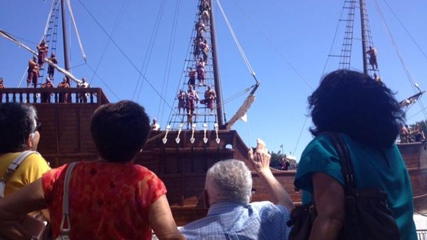 Una vez terminado el acto oficial del Diálogo entre el Castillo y La Nave, sobre las 12:00 horas, la tripulación de la nave formó en cubierta y subió a la jarcia para recibir a Don Pepe Feliciano, que llegó a la plaza de La Alameda para felicitar a su tripulación. El capitán de la nave fue recibido con honores marineros, saludado desde la distancia con tres vivas al capitán y con el gorro en el pecho por sus más de treinta marineros, quienes a continuación, bajaron a la plaza en perfecta fila y formación para darle un personal, caluroso y emotivo saludo.