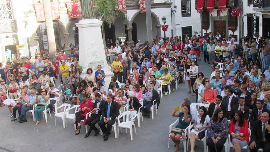 Palmeras, palmeros, forasteros: llega la hora de disfrutar. Hace cinco años compartí con vosotros, en la plaza de la Alameda, el triunfo de la Selección Española en el Mundial. En 2010, La Roja nos hizo vibrar y saltar de felicidad, y sé que este próximo año vais a vibrar también con El Mensajero, que ya compite en 2 división B. Llega la hora de danzar, de cantar —y de escuchar a Los Sabandeños, dentro de un rato—. Llega la hora de vestirse para acompañar a la Virgen de las Nieves en su camino hasta la ciudad; de engalanar los balcones y de sobresaltarse con los cañonazos que llegan del Castillo, de brindar con los forasteros y de gozar de vuestros vecinos y amigos.