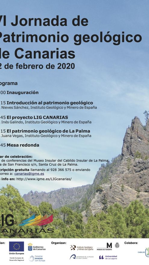 El Cabildo de La Palma acogerá este miércoles, 12 de febrero, la VI Jornada de Patrimonio Geológico de Canarias organizadas por el Instituto Geológico y Minero de España, Museos de Tenerife y las Universidades de La Laguna y Las Palmas de Gran Canaria, informa en una nota de prensa. El Salón de Plenos de la institución insular albergará este encuentro, en sesión de mañana, de 11:00 a 14:00 horas, mientras que por la tarde las sesiones tendrán lugar desde las 17:00 horas en el Museo Insular, estas últimas de carácter abierto al público.