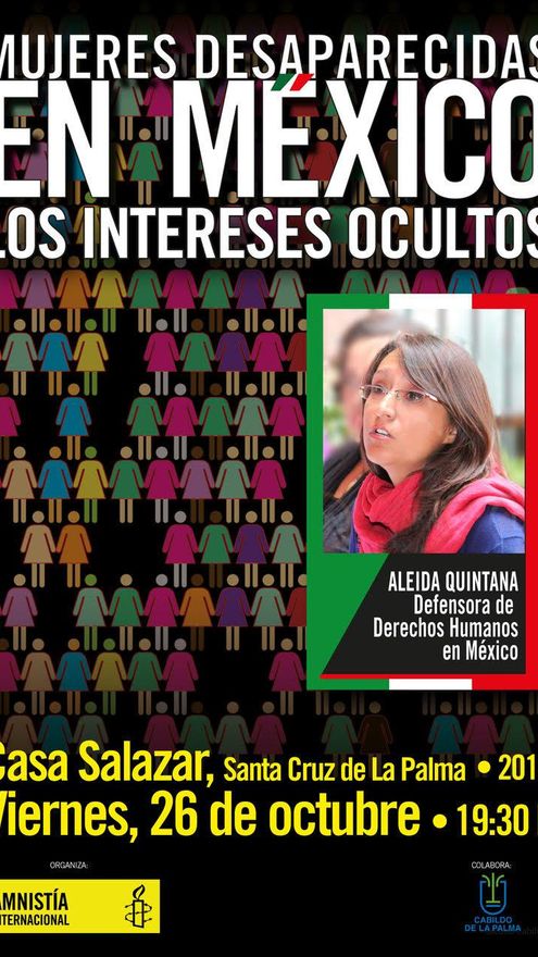 Amnistía Internacional (AI) invita a la charla coloquio, que con el título Mujeres desaparecidas en México: los intereses ocultos, tendrá lugar este viernes, día 26 de octubre, a las 19:30 horas, en la Casa Principal de Salazar de Santa Cruz de La Palma, informa en nota de prensa.
