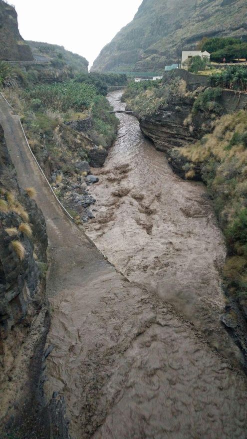 Las lluvias también son copiosas. Hasta las 19.20 horas, en el núcleo de San Pedro, en Breña Alta, se han recogido más de 116 litros por metro cuadrado. Es el punto de la Isla donde, hasta la citada hora, más agua han descargado las precipitaciones. Le seguía Miraflores, en Santa Cruz de La Palma, con 110 litros.