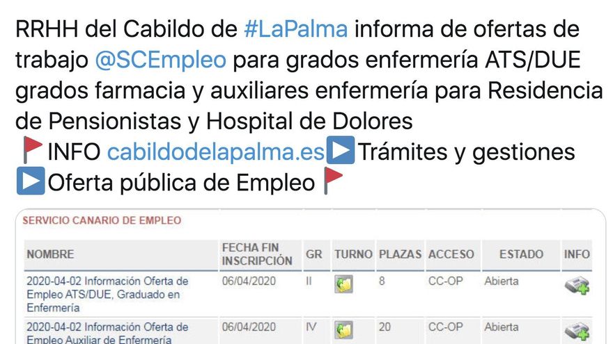 Esta oferta de empleo pública, informa Efe, que se ha realizado este miércoles viene a reforzar los servicios que en ambos centros sociosanitarios se prestan, en especial en estos días en los que se ha conocido que un profesional de la Residencia de Pensionistas ha dado positivo por COVID-19 y varios profesionales que coincidían en turno han sido puestos en cuarentena, ha informado a Efe el presidente del Cabildo palmero, Mariano Hernández Zapata.