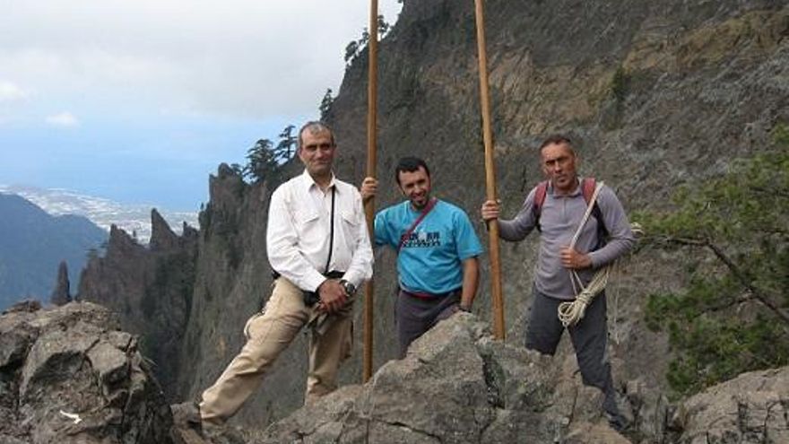 (Ángel Palomares -izquierda- en la subida de Risco Liso, en el topo de Marangaño, al fondo Los Agujeritos, con Rubén Arrocha y Eduardo Pérez Cáceres).Ángel Palomares -izquierda- en la subida de Risco Liso, en el topo de Marangaño, al fondo Los Agujeritos, con Rubén Arrocha y Eduardo Pérez Cáceres