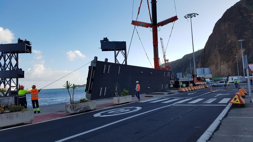En la tarde de este miércoles, 17 de enero, ha comenzado la instalación en la bocana de la marina del Puerto de Santa Cruz de La Palma de las dos grandes compuertas que permitirán el cierre hermético de la bocana para reducir la agitación de la lámina de agua en el interior de la dársena causada por el mar de fondo. En las labores de acople de las compuertas en las torres y rieles que se han colocado previamente se emplea una potente grúa de gran envergadura de 70 toneladas.